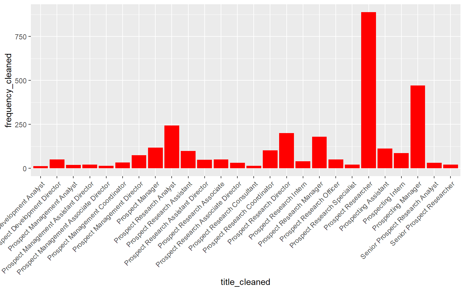 Tangent: You’ll notice that “Prospect Researcher” is the most common job title, by far, for that niche, and ends up becoming their standardized term for that role at a junior level. However, as soon as you add the word “analyst” to the title (e.g. Senior Prospect Research Analyst), that word becomes the standard - so Senior Prospect Research Analysts become standardized into Senior Analysts. This was useful for their analysis, but to properly understand how many “Prospect Researchers” there are - those aggregates will have to be recalculated using a more ecclectic definition. However, given the massive overlap between these niche Prospect Dev roles, perhaps the best aggregate is actually “Prospect Development Professional” to get more accurate totals from the dataset.